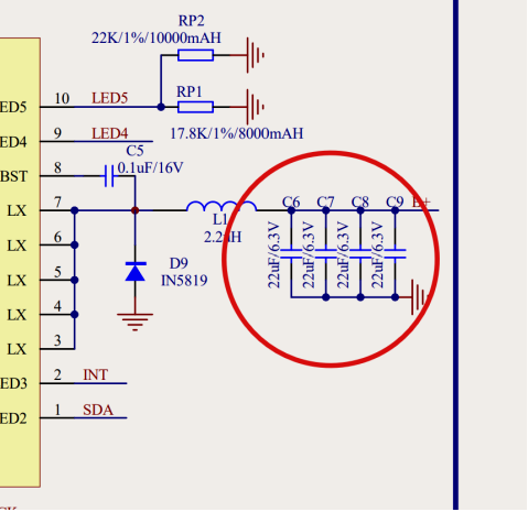 2. 输出滤波优化:将 C6-C9 的 22μF/6.3V 电容,更换为1μF/50V高频电容,提升高频滤波效果,同时用高耐压规避尖峰击穿风险。